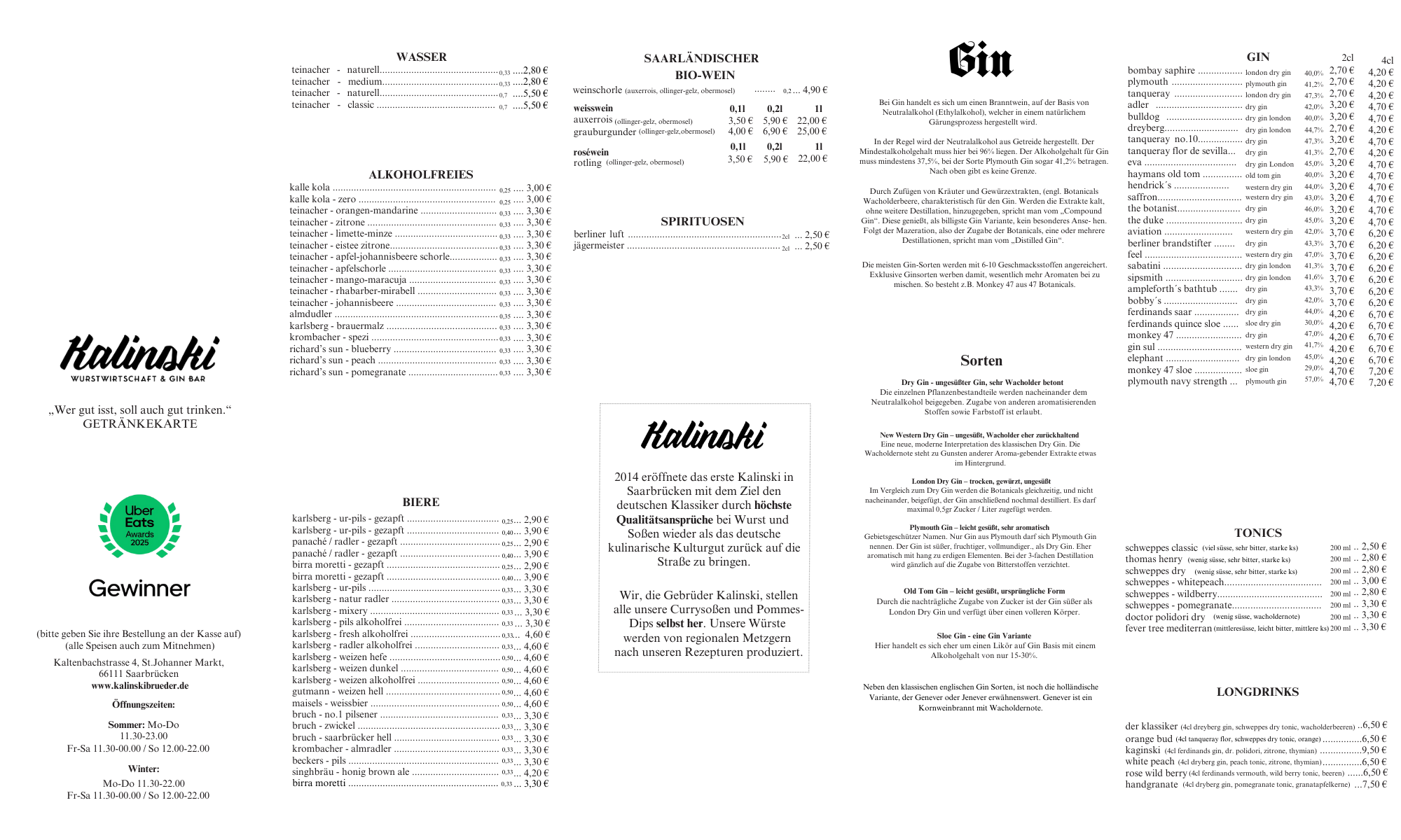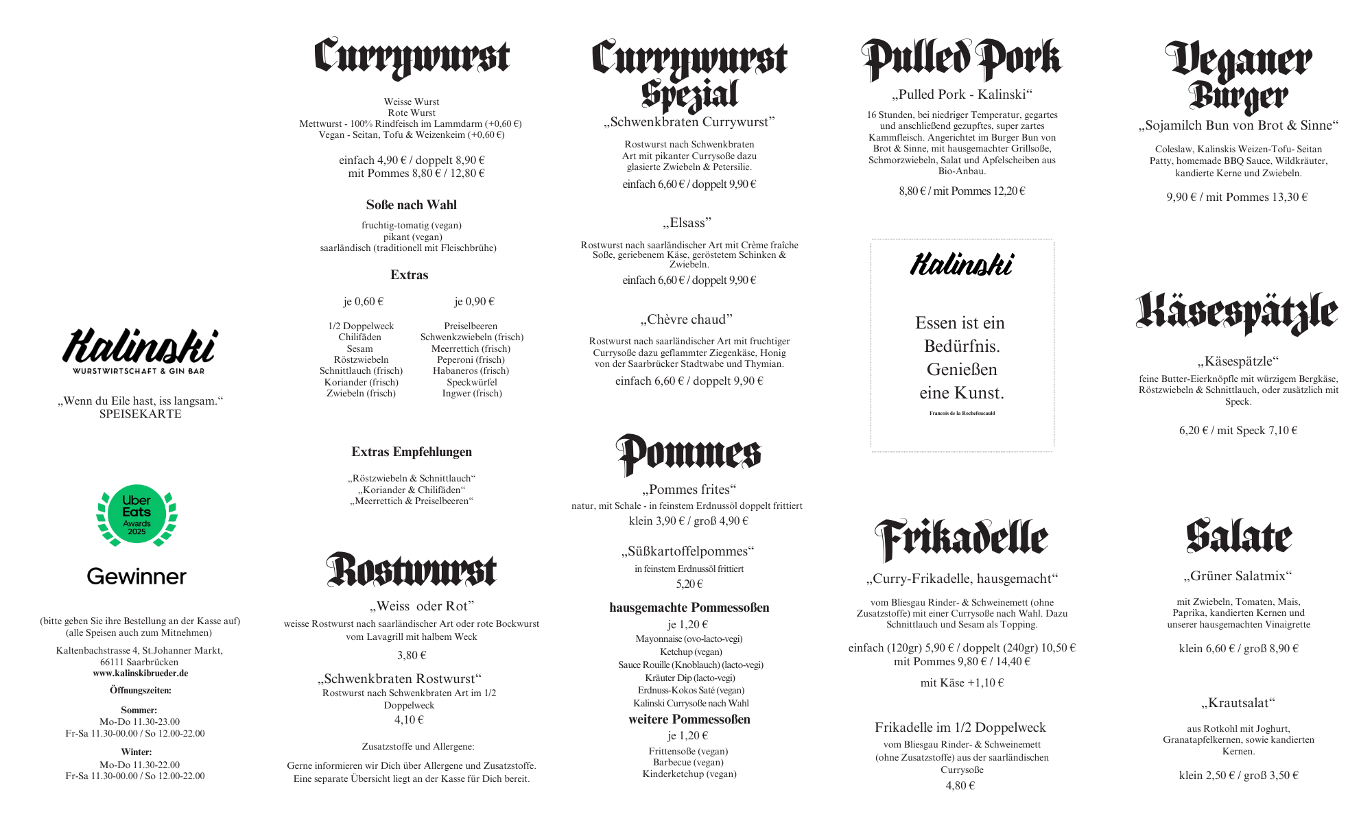 2014 eröffnete das erste Kalinski in Saarbrücken mit dem Ziel den deutschen Klassiker durch höchste Qualitätsansprüche bei Wurst und Soßen wieder als das deutsche kulinarische Kulturgut zurück auf die Straße zu bringen.